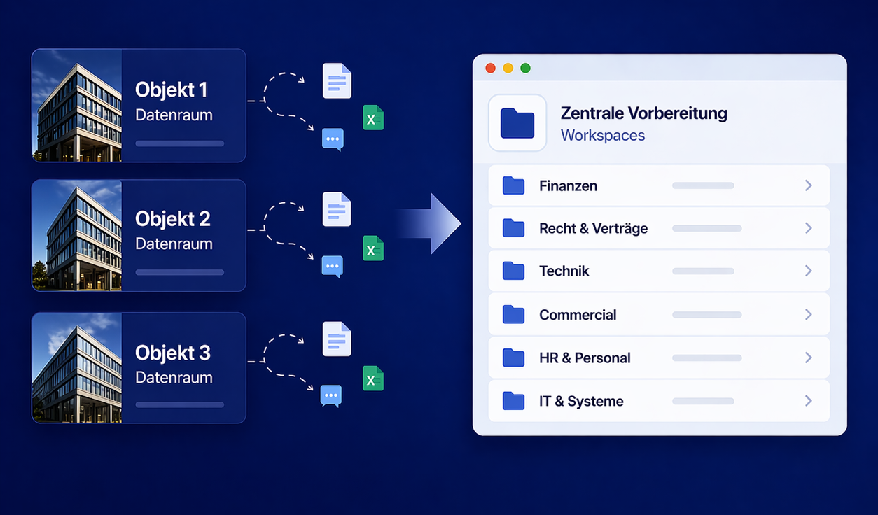 in der Vorbereitung auf Sell-Side-Seite. Hier geht in vielen Prozessen bereits Zeit verloren, lange bevor ein Käufer überhaupt Zugriff auf einen Datenraum erhält. Dokumente müssen gesammelt, strukturiert und abgestimmt werden.